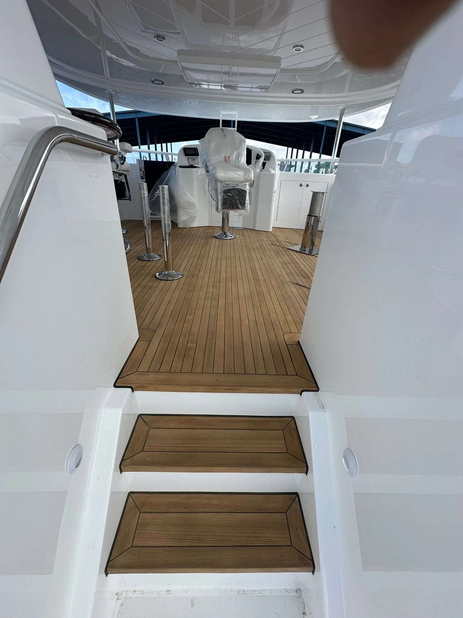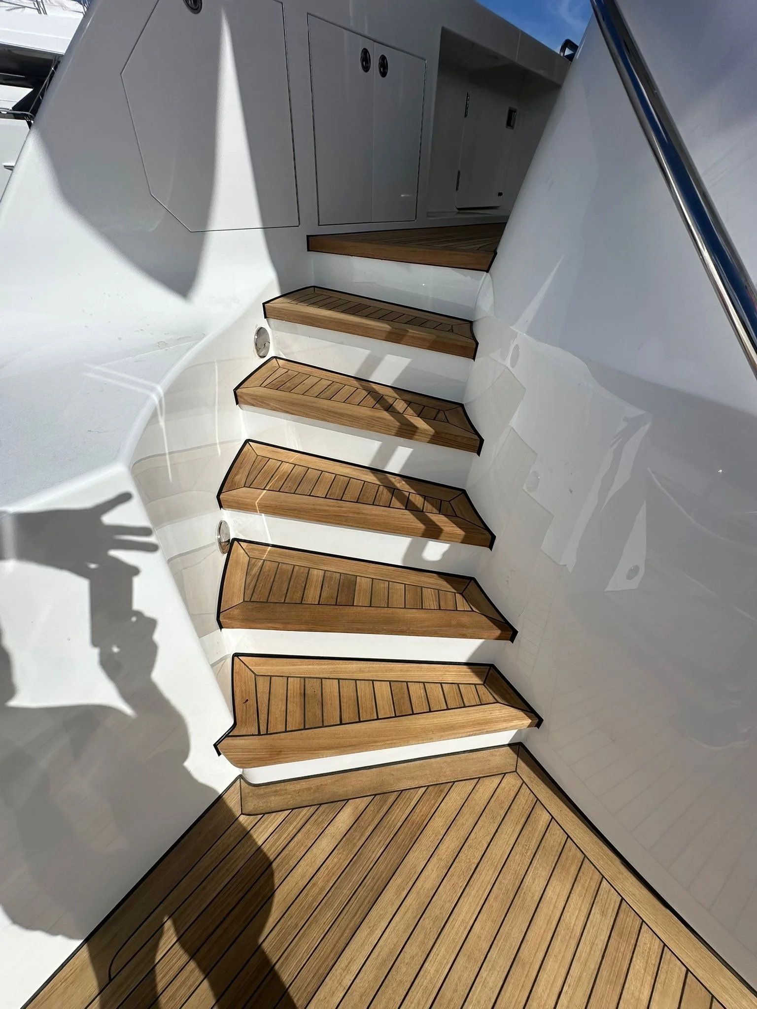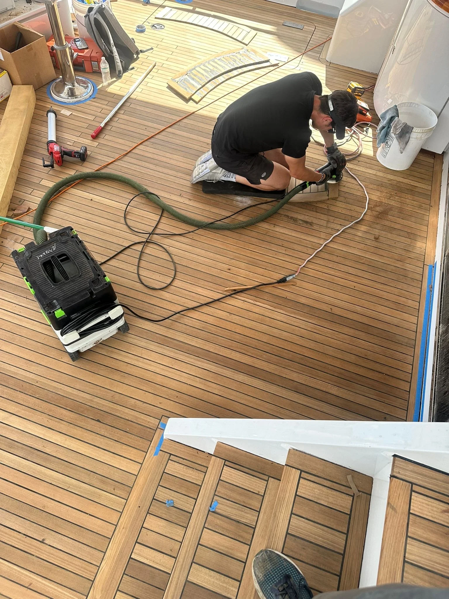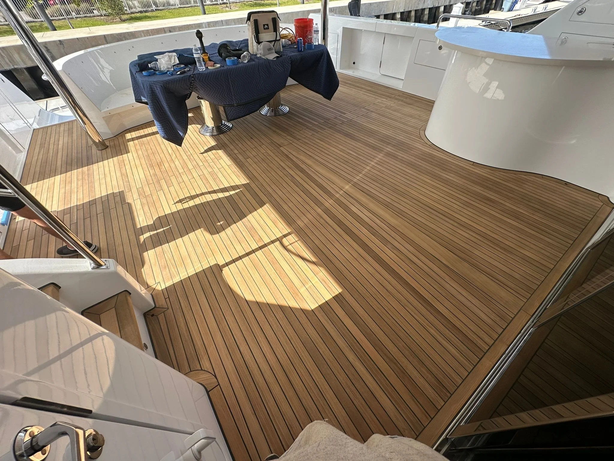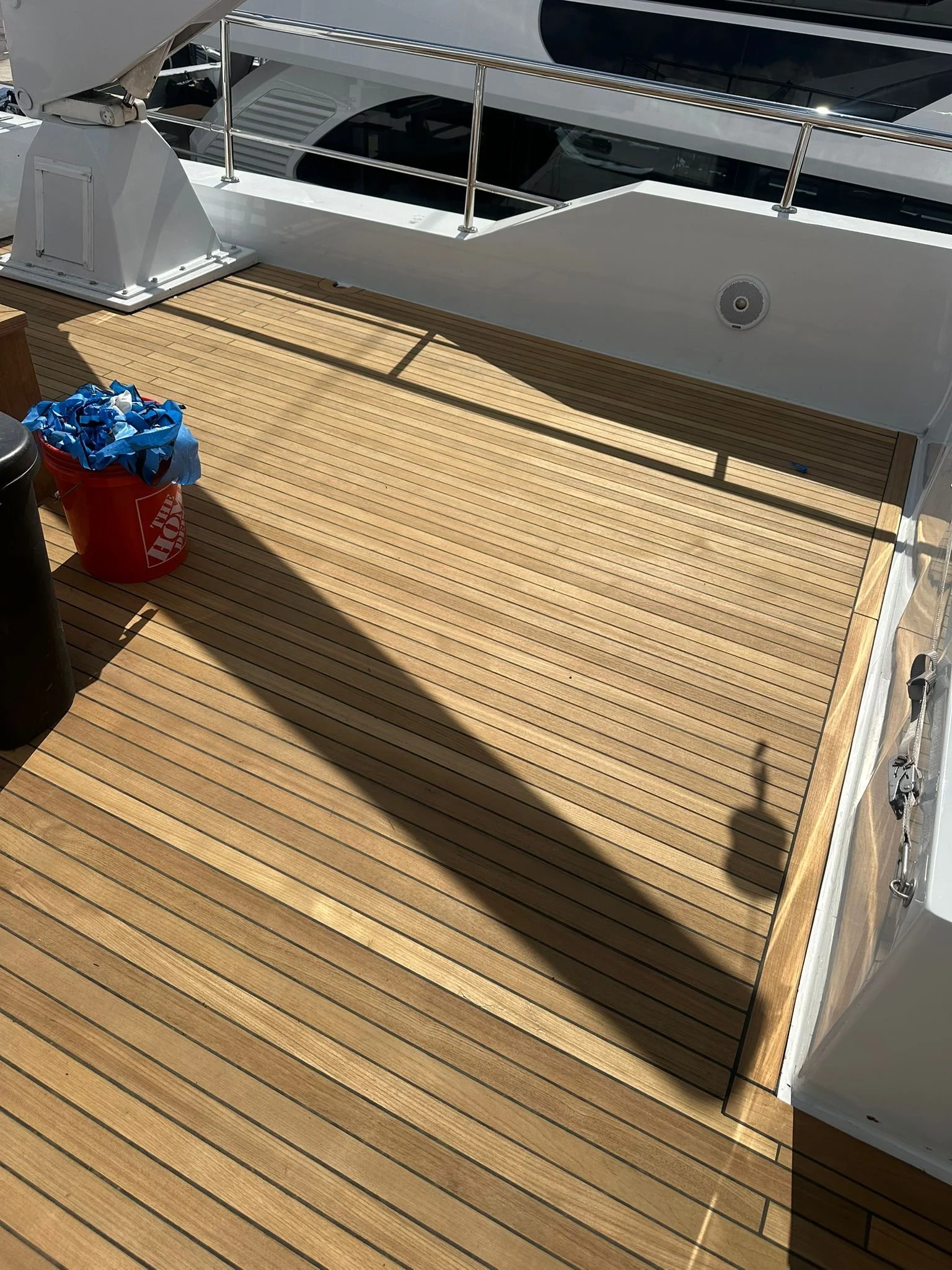 • Accurate measurements of the space will be taken, and the new teak wood will be precisely cut to fit the designated areas. The pieces are then carefully fitted and installed onto the boat, using marine-grade adhesive. Lastly, the installed teak is sanded to achieve a smooth and uniform surface, finished off with caulking details around the teak edges.